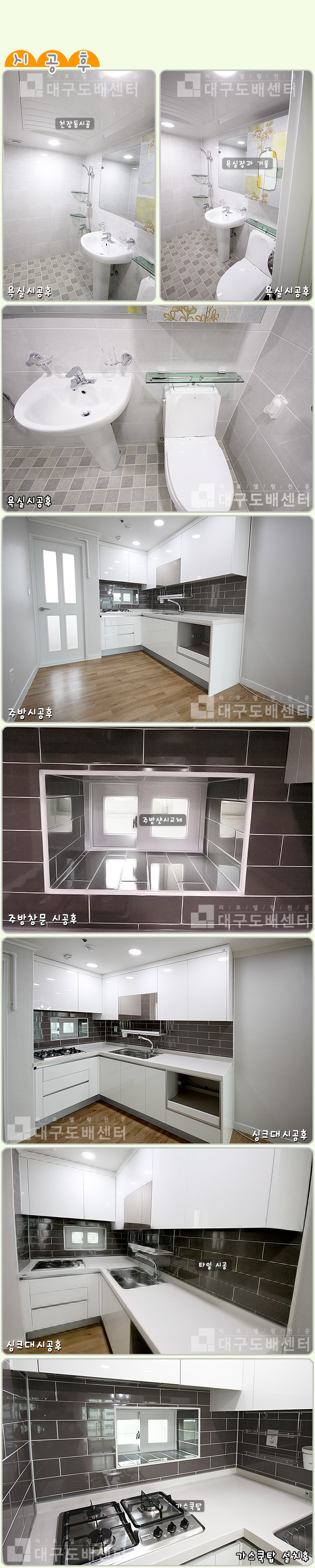 경산시 옥산동 평광신화아파트 103동 79㎡(24평) 리모델링공사 ② 욕실, 주방 운영자 (220.♡.32.32) 20평형대 0 3181 2017.04.14 18:45 욕실, 주방 리모델링 공사 후 스케치입니다.--------------------------------------------------------------------천장돔 및 욕실장과 거울 시공하였고, 주방에는 주방창문 샷시 교체, 싱크대, 싱크대 타일 시공, 가스쿡탑 등을 시공하였습니다.