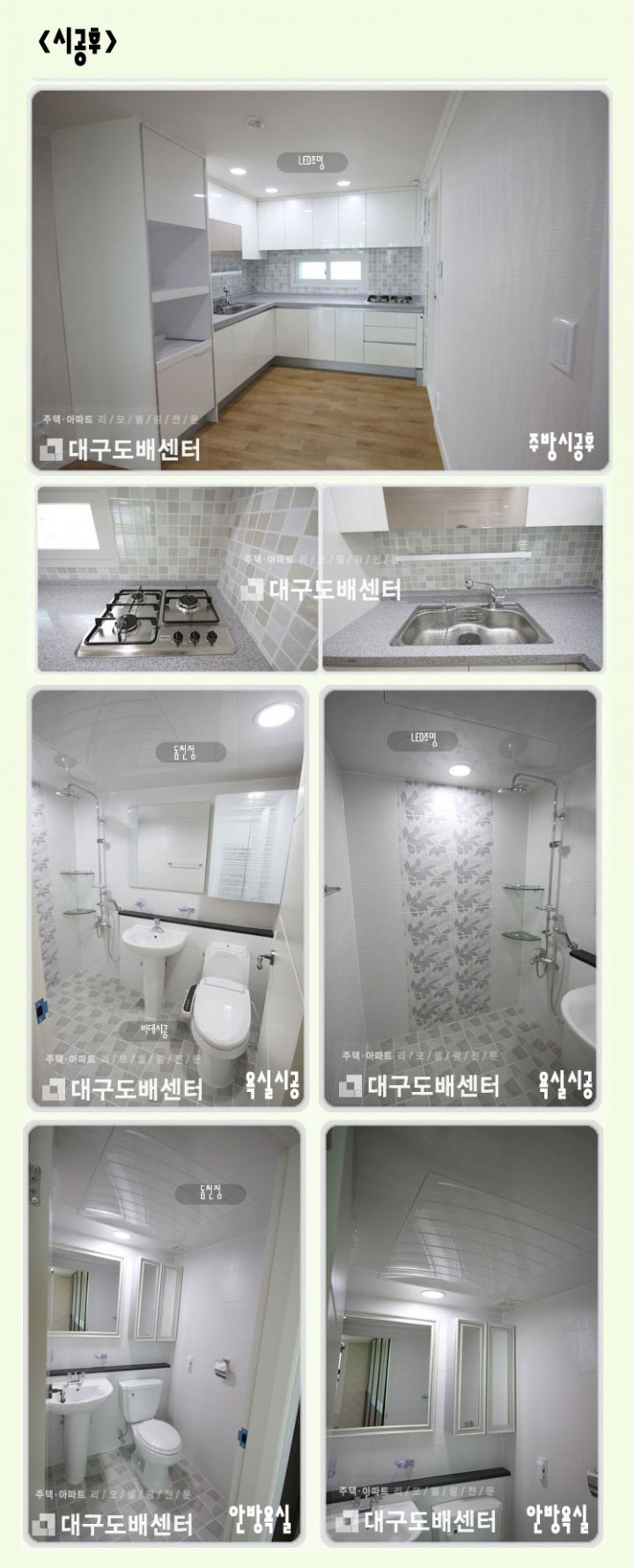 경북 경산시 정평동 현대아파트 104동(31평) 싱크대, 욕실 리모델링공사 운영자 (220.♡.18.247) 30평형대 0 9070 2014.07.17 17:00 20년 넘은 아파트를 수리 했습니다.도색, 실크도배, 장판공사, 한샘싱크대, 욕실공사, LED조명 교체스위치, 콘센트 교체, 인터폰, 디자털키 등을 시공하였습니다.주인분이 완전 새집이 되었다고 좋아하시네요. 저희도 뿌듯합니다.^^