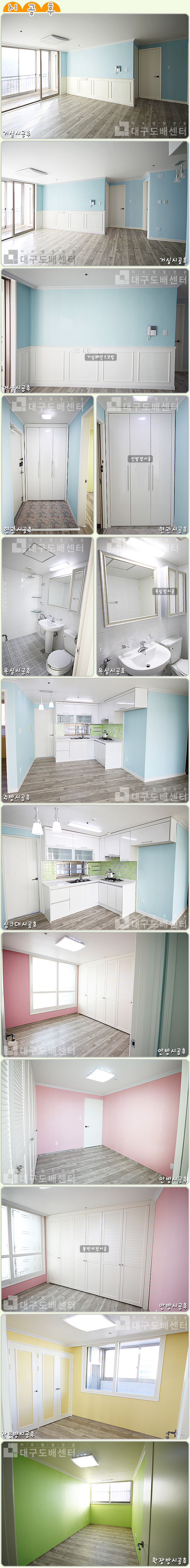경산시 정평동 현대타운 24평(79㎡) 리모델링공사 운영자 (59.♡.140.223) 20평형대 0 4685 2012.08.07 16:35 리모델링 공사 후 스케치입니다.----------------------------------------------------- 도색 및 도배공사, 장판시공, 거실에는 웨인스코팅하였습니다.기타 욕실공사, 안방에 붙박이장시공, 현관에 신발장시공 그외 조명, 스위치콘센트공사등을 했습니다.