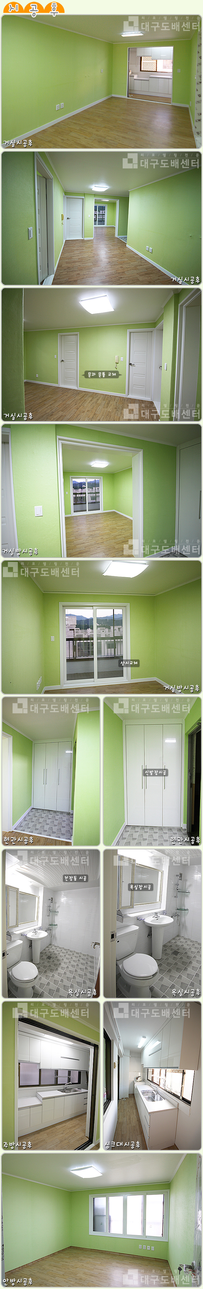 대구시 수성구 황금동 우방아파트 210동 24평(79㎡) 리모델링공사 운영자 (211.♡.108.68) 20평형대 0 5583 2012.10.15 21:18 리모델링 공사 후 스케치입니다.----------------------------------------------- 도배 및 장판공사, 욕실공사, 조명과 스위치콘센트 교체, 거실방 샷시교체 했습니다.각각 문과 문틀교체하였고 현관 신발장 및 타일 시공, 디지털키 시공등을 했습니다.