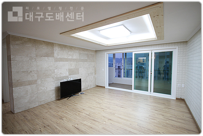 거실에는 아트월 돌시공, 샷시 교체, 원목 등박스 등을 시공 하였습니다.
