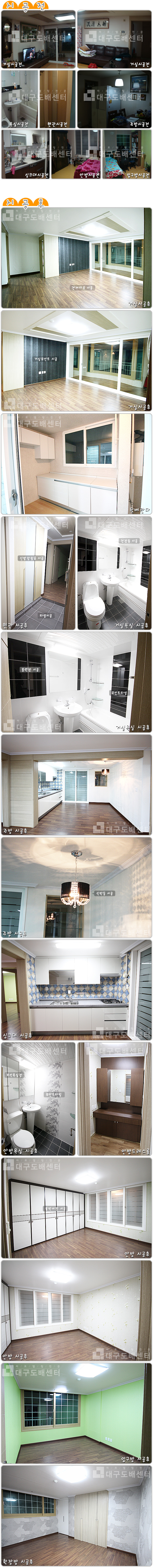대구시 수성구 신매동 태왕4차아파트 102동 32평(105㎡) 리모델링공사 운영자 (121.♡.120.231) 30평형대 0 5760 2012.01.20 20:51 리모델링 공사 사진 스케치입니다. ------------------------------------------------- 주인분이랑 화이트 앤 블랙으로 컨셉을 잡고 거실포인트와 식탁등을 블랙으로 했습니다. 거실욕실은 블랙포인트타일과 블랙장으로 맞추었습니다. 안방욕실은 포인트타일과 보석거울장으로 아기자기한 분위기를 냈습니다. 그외에 욕실문교체, 문필름시공, 실크도배, 전체마루시공, 조명, 스위치콘센트교체, 한샘싱크대, 싱크타일, 현관타일, 안방붙박이장, 몰딩공사등을 했습니다.
