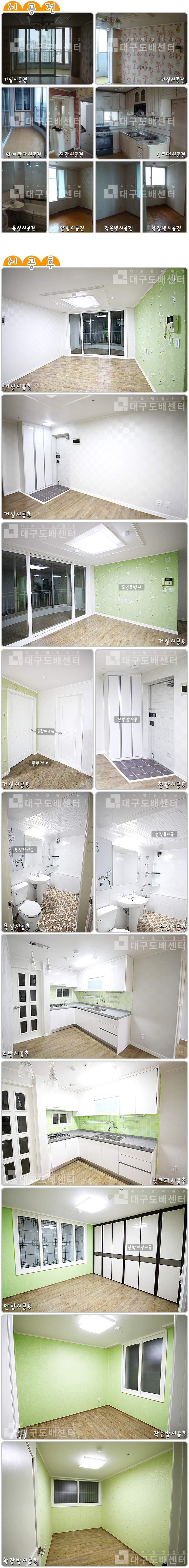 대구시 수성구 신매동 시지신화빌라트 104동 24평(79㎡) 리모델링공사 운영자 (118.♡.244.91) 20평형대 0 5417 2012.01.27 14:51 리모델링 공사 사진 스케치입니다. ------------------------------------------------- 도배, 장판, 욕실공사, 한샘싱크대, 신발장, 안방붙박이장, 도색, 문턱제거, 조명, 스위치콘센트,문손잡이, 디지털키 교체등을 했습니다.