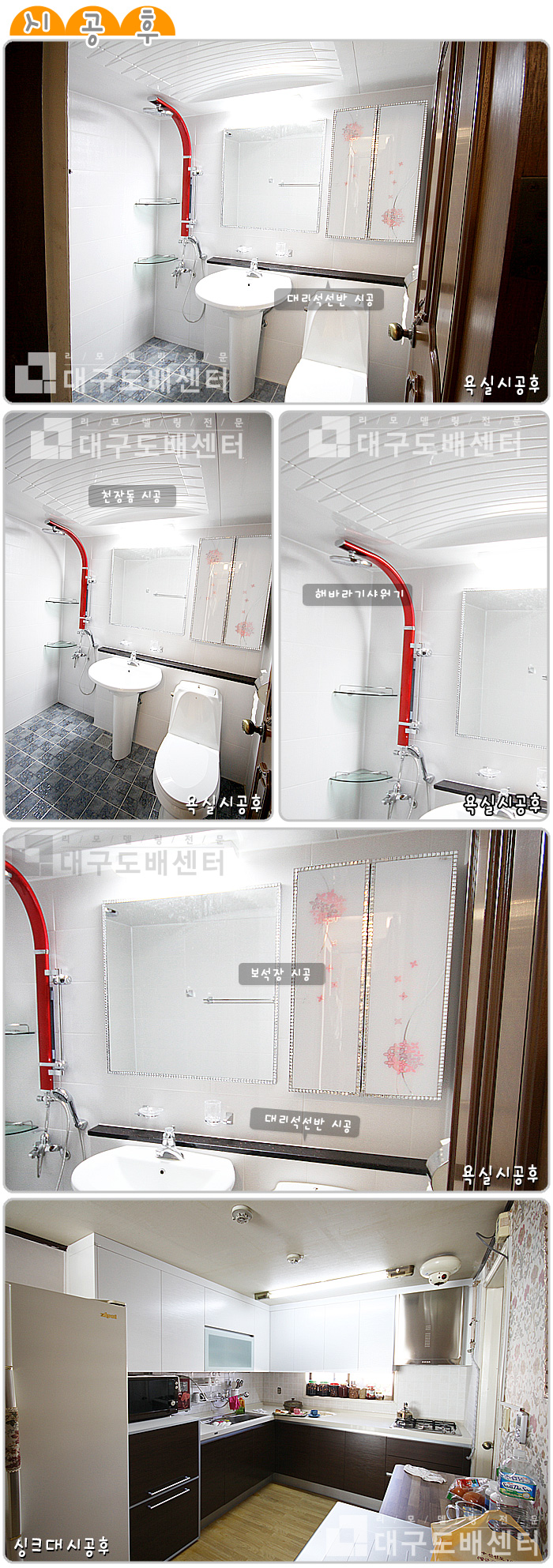 경산시 정평동 현대아파트 102동 32평(105㎡) 욕실/ 싱크대공사 운영자 (121.♡.207.166) 30평형대 0 7189 2012.02.13 17:46 리모델링 공사 사진 스케치입니다. ------------------------------------------------- 사시는분 집에 욕실공사와 싱크대 교체했습니다. 욕실장 아래 검은색 선반부분에 대리석으로 선반시공하였고 빨강해바라기 샤워기 설치, 천장에 돔 시공, 욕실장은 보석장(장, 거울테두리 모두 보석박혀있음)으로 시공 주방에 싱크대는 한샘싱크대를 시공했습니다.