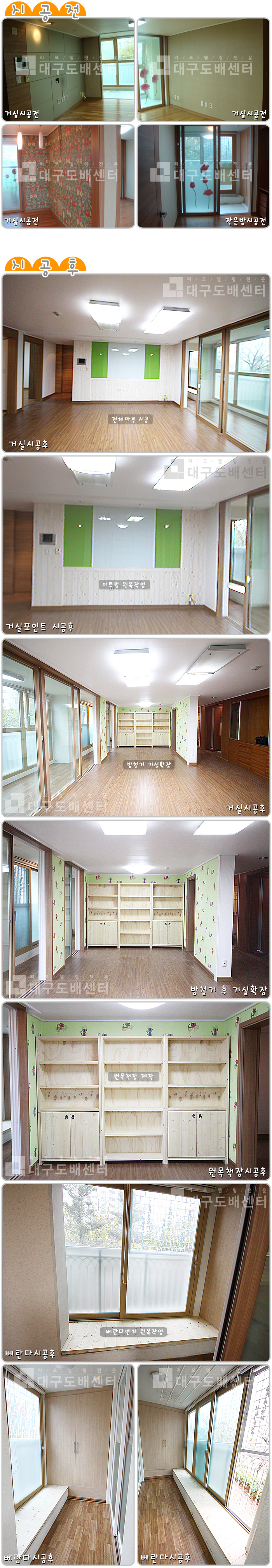 대구시 북구 침산동 코오롱 하늘채 213동 42평(138.8m²) 리모델링공사 운영자 (118.♡.244.23) 40-50평형대 0 5581 2012.03.17 16:06 리모델링 공사 사진 스케치입니다. ------------------------------------------------- 방을 철거하여 거실을 넓게 확장, 아이 놀이방으로 활용할 예정입니다. 실크도배, 마루공사, 화단 원목작업, 아트월 원목작업, 원목책장을 제작 했습니다.