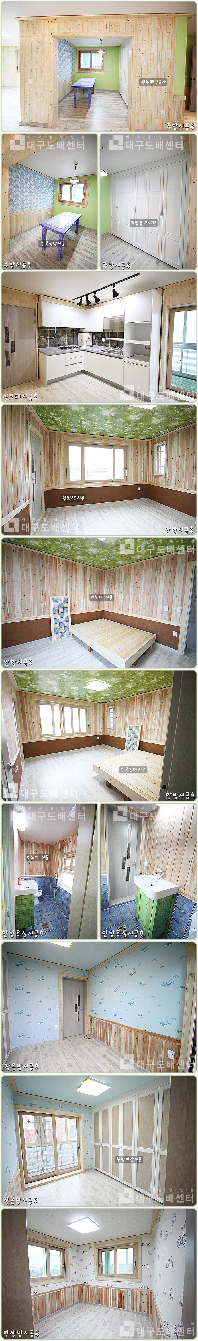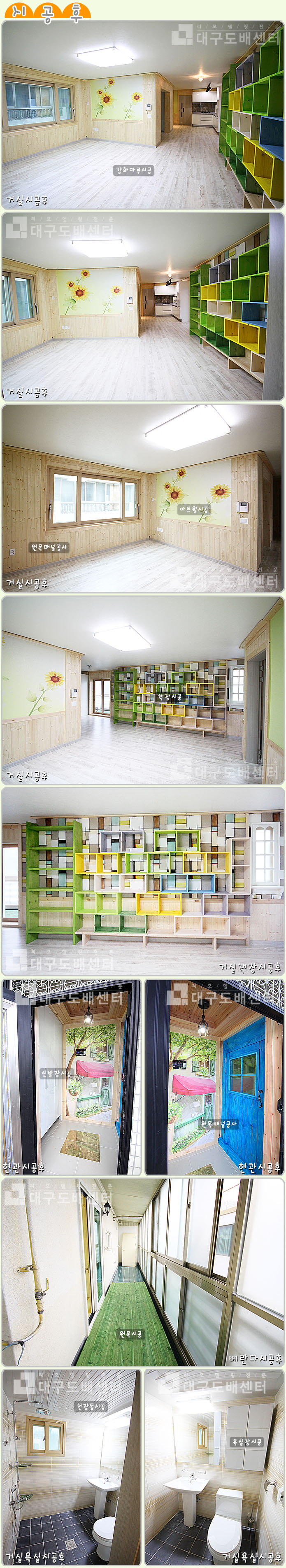 경산시 옥산동 748-4번지 주택 42평(138㎡) 리모델링공사 운영자 (118.♡.244.90) 40-50평형대 0 4989 2012.04.27 00:45 리모델링 공사 후 스케치입니다.-----------------------------------------------------전체 동화 강화마루시공, 전체 LG 샷시교체, 단열재 시공, 원목 패널공사, 실크도배, 조명, 스위치콘센트 등을 시공하였고거실에 아트월 시공, 안방에 황토보드시공, 안방과 작은방 히노끼 시공하였습니다.안방욕실, 거실욕실공사, 한샘싱크대, 한샘신발장을 시공하였고,주방과 작은방에 각각 붙박이장 시공, 현관에는 타일 시공, 원목패널공사, 그외 몰딩작업하였습니다.