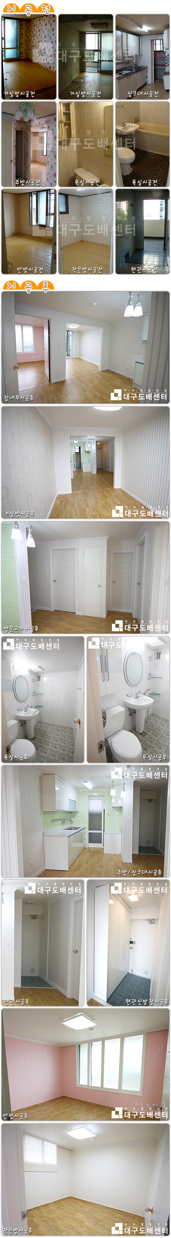 대구시 중구 남산동 까치아파트 22평(72m²) 리모델링공사 운영자 (121.♡.120.227) 20평형대 0 36178 2010.10.16 20:32 리모델링 시공 후 공사스케치입니다. --------------------------------- 도색, 도배, 장판, 문과문틀교체, 몰딩과 걸레받이 시공, 욕실공사, 거실에서 베란다 나가는 샷시 교체, 싱크대, 신발장, 조명, 스위치콘센트, 디지털키, 문손잡이교체, 졸라톤시공 등을 했습니다.