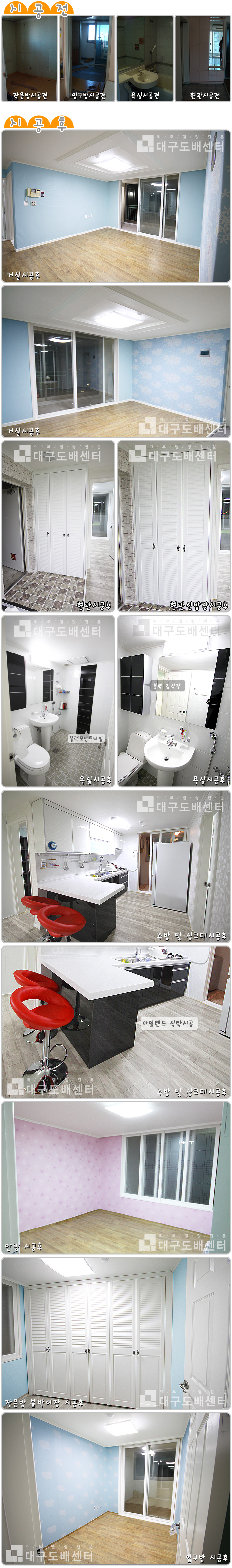 경산시 중방동 경남신성아파트 24평(76㎡) 리모델링공사 운영자 (14.♡.31.210) 20평형대 0 5038 2011.01.28 15:35 리모델링 공사 사진 스케치입니다. ------------------------------ 도색, 도배, 장판, 조명, 스위치콘센트 공사 등을 하였고 작은방 붙박이장공사, 문손잡이교체, 신발장등을 했습니다. 욕실에는 블랙 포인트타일에 블랙장으로 시공하였으며, 주방 싱크대엔 아일랜드 식탁을 시공하였습니다.