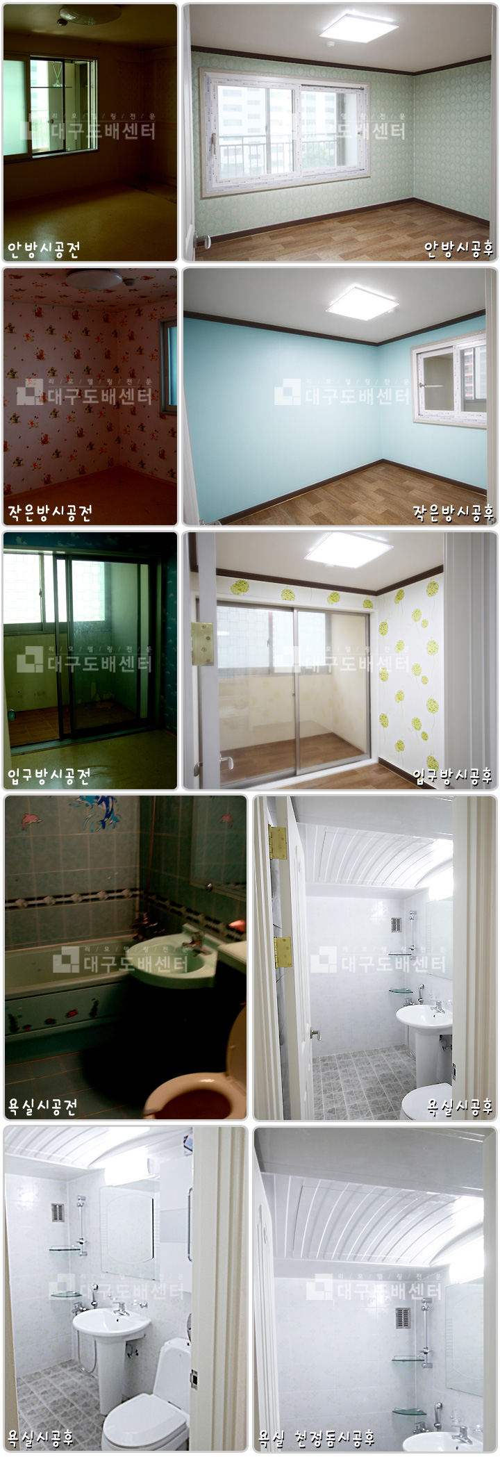 경산시 옥산동 평광신화아파트 24평(79㎡) 리모델링(안방,작은방,욕실) 운영자 (118.♡.244.99) 20평형대 0 4603 2010.05.21 01:58 리모델링 공사 후 스케치입니다. -------------------------------- 실크도배, 장판교체, 안방, 작은방 샷시 교체를 했습니다. 욕실공사는 기존의 욕조를 없앴고 욕실천정에는 천정돔공사를 했습니다.