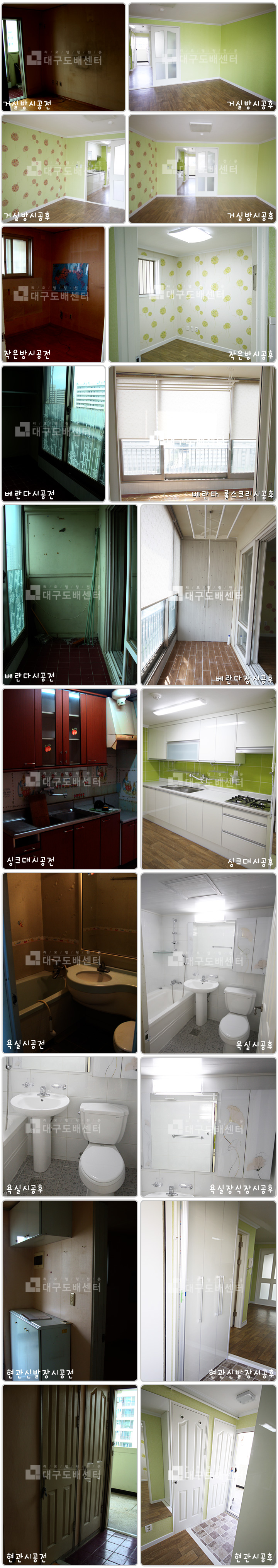 대구시 수성구 매호동 두레타운 17평(56㎡) 리모델링공사 운영자 (121.♡.207.181) 20평형대 0 5137 2010.06.18 22:17 리모델링 공사후 스케치입니다. ---------------------------- 도색, 실크도배,장판, 욕실공사, 싱크공사, 졸라톤 , 베란다타일, 현관타일, 신발장,베란다장, 조명, 스위치콘센트공사, 디지털키, 문손잡이교체, 방충망, 인터폰교체등을 하였습니다.