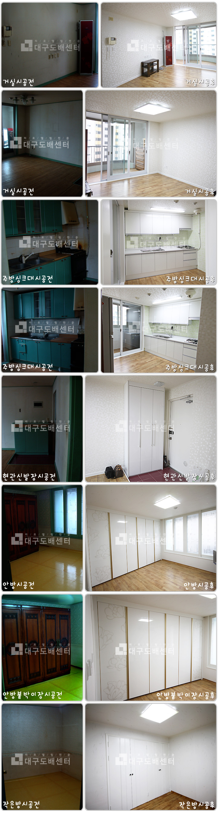 경산시 중산동 태왕한라 22평(72㎡) 아파트 리모델링공사 운영자 (121.♡.207.181) 20평형대 0 4865 2010.06.20 20:09 리모델링 시공 후 공사 스케치입니다. --------------------------------- 어른 두분이 오랫동안 사시다가 큰맘먹고 짐정리하셔서 집수리를 하셨습니다 화려한것 보다는 깔끔하고 무난한걸 원하셔서 집전체가 화이트톤 시공하였습니다. 도색, 도배,장판, 싱크, 신발장, 조명, 스위치, 안방에는 붙박이장 설치했습니다. 집이 환해져서 너무 좋다고 하셔서 저희도 무척 기분 좋았습니다. 사시는 분이 좋아하는집, 대구도배센터가 원하는 집입니다.