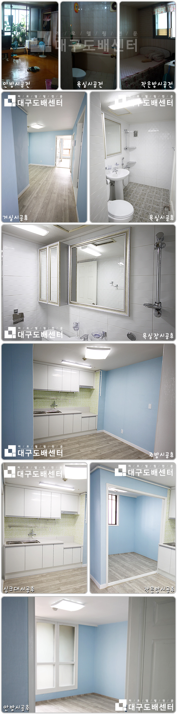 대구시 북구 검단동 유성아파트 19평(62m²) 리모델링공사 운영자 (112.♡.111.241) 20평형대 0 5178 2010.09.17 17:42 리모델링 시공 후 공사스케치입니다. --------------------------------- 오래된 아파트지만 깔끔하게 수리 하시길 원하셔서 파스텔톤의 벽지와 화이트톤의 싱크와 욕실로 마무리 하였습니다. 도배, 장판, 욕실, 싱크, 조명공사 등을 했습니다.