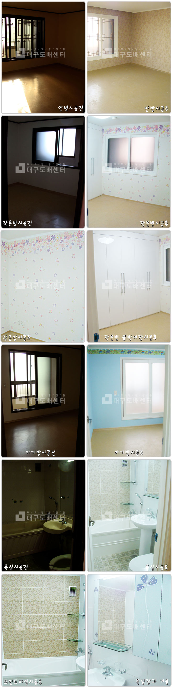 대구시 수성구 수성동1가 신세계아파트 32평 리모델링 공사 운영자 (118.♡.244.18) 30평형대 0 5023 2010.02.07 01:19 리모델링 시공후 스케치입니다. ---------------------------- 거실한쪽 면은 포인트 벽지로 시공하였습니다. 베란다 샷시 교체 시공하였습니다. 현관타일교체 및 신발장 시공하였습니다. 욕실 포인트 타일 시공하였고, 안방, 작은방, 아기방 각각 장판, 도배시공하였습니다. 작은방에는 붙박이장 시공하였습니다.