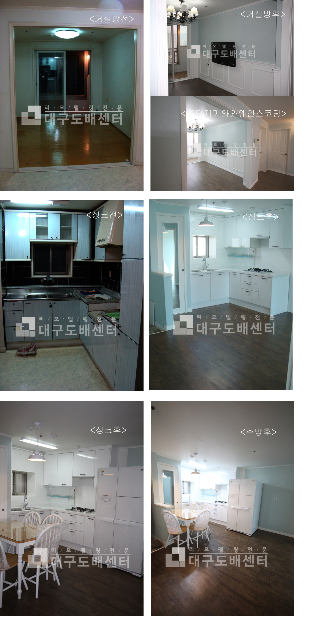 대구시 동구 신천동 푸른우방타운 25평 아파트 리모델링(거실, 주방) 운영자 (121.♡.95.186) 20평형대 0 4216 2010.02.18 16:31 도색, 문턱제거, 실크도배, 데코타일, 웨인스코팅, 걸레받이시공, 싱크대, 욕실공사, 조명, 스위치콘센트, 신발장, 현관타일, 디지탈키등을 설치하였습니다.
