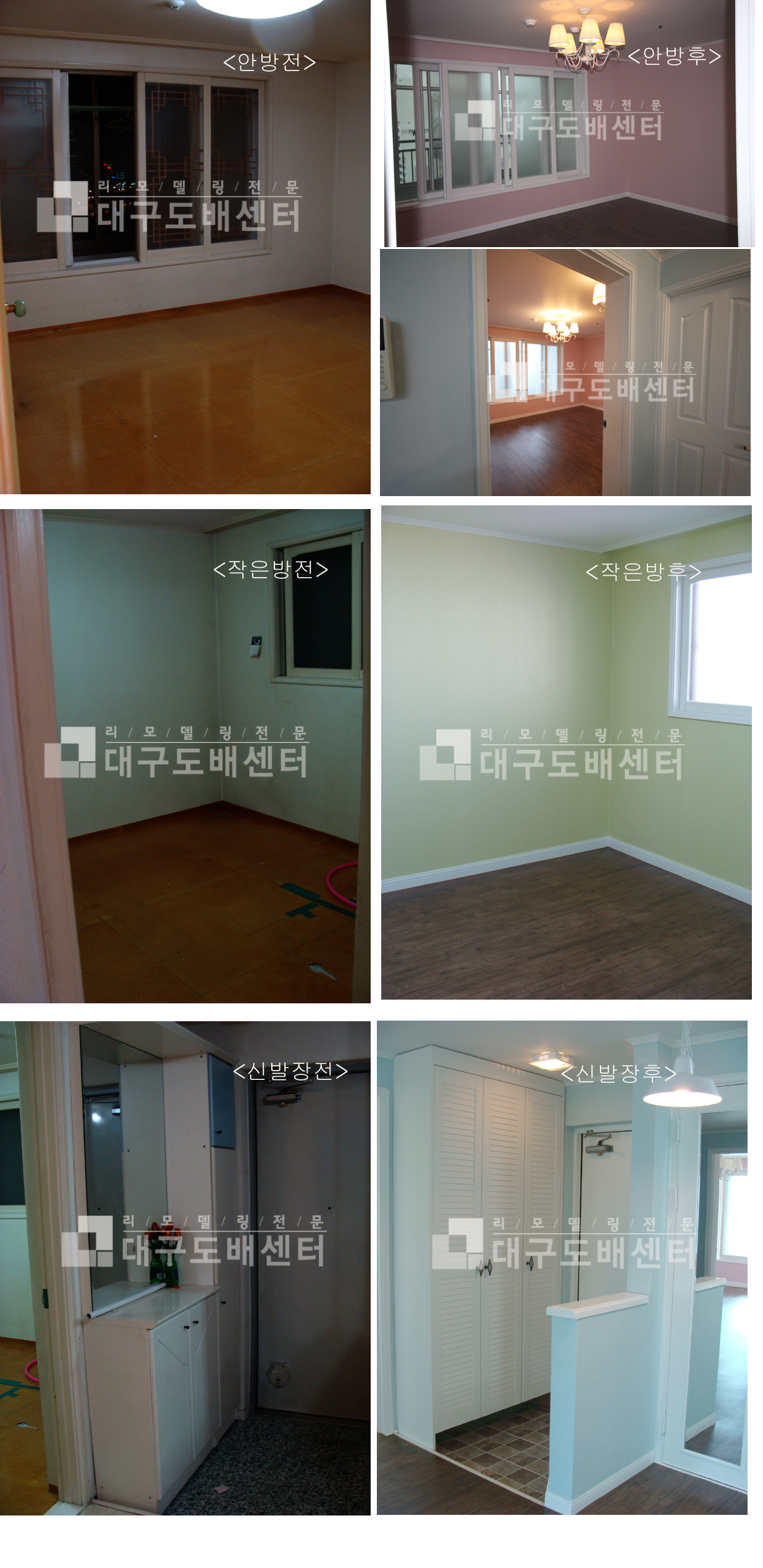 대구시 동구 신천동 푸른우방타운 25평 아파트 리모델링(안방,작은방) 운영자 (121.♡.95.186) 20평형대 0 4475 2010.02.18 17:26 푸른우방타운 25평은 거실방, 안방, 작은방으로 되어있다. 단색 파스텔톤으로 도배를 원하셔서 안방은 핑크, 작은방은 그린으로 도배를 했습니다. 현관에는 타일을 시공하고 신발장을 갤러리로 교체 했습니다