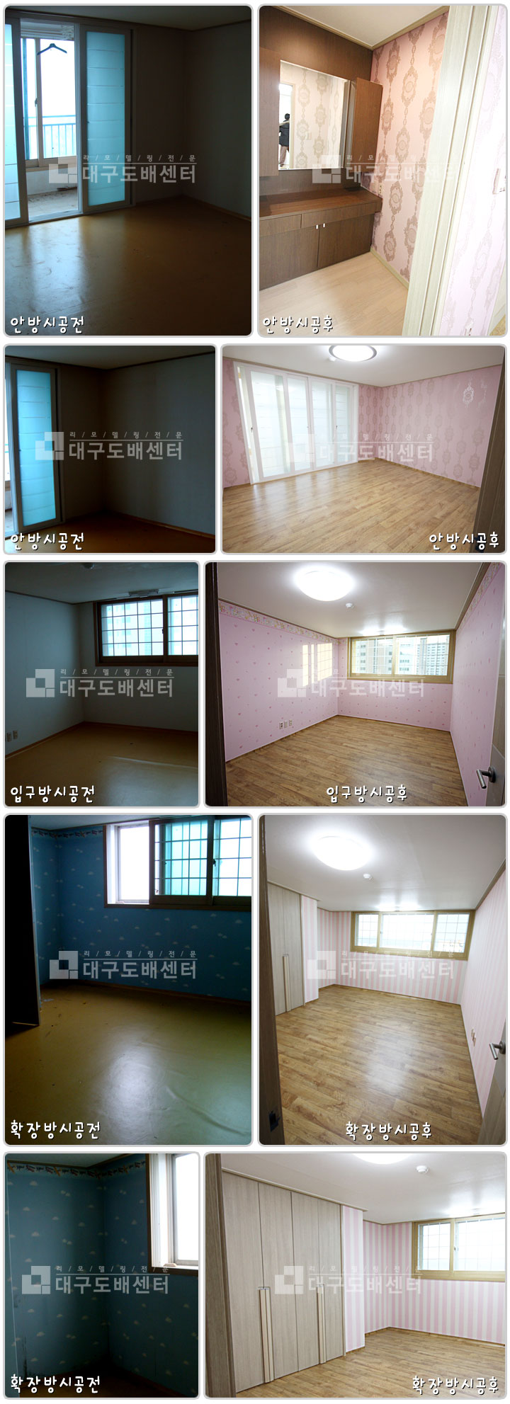 대구 수성구 욱수동 시지4차 태왕하이츠레전드 리모델링(안방,입구방등) 운영자 (118.♡.244.74) 일반 0 3335 2010.02.26 00:31 안방, 입구방, 확장방 시공후 스케치입니다. -------------------------------------- 도배, 장판, 조명교체 등 시공하였습니다.