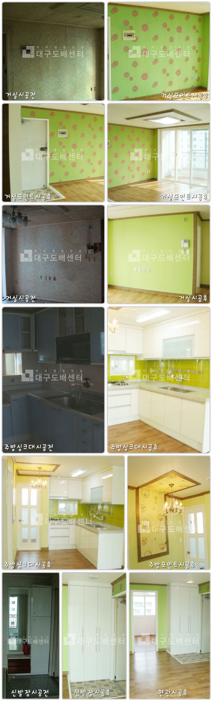 경산시 옥산동 평광신화아파트 24평 리모델링(거실, 주방공사) 운영자 (118.♡.244.199) 20평형대 0 4376 2010.01.03 22:59 거실 및 주방, 현관 공사 스케치입니다. ----------------------------- 도색, 실크도배, 장판공사 하였고, 거실 한쪽면을 포인트벽지로 시공하였습니다. 주방의 싱크공사하였고, 포인트 및 조명 전기공사하였습니다. 현관 신발장 교체하였고. 디지탈 키 시공했습니다.