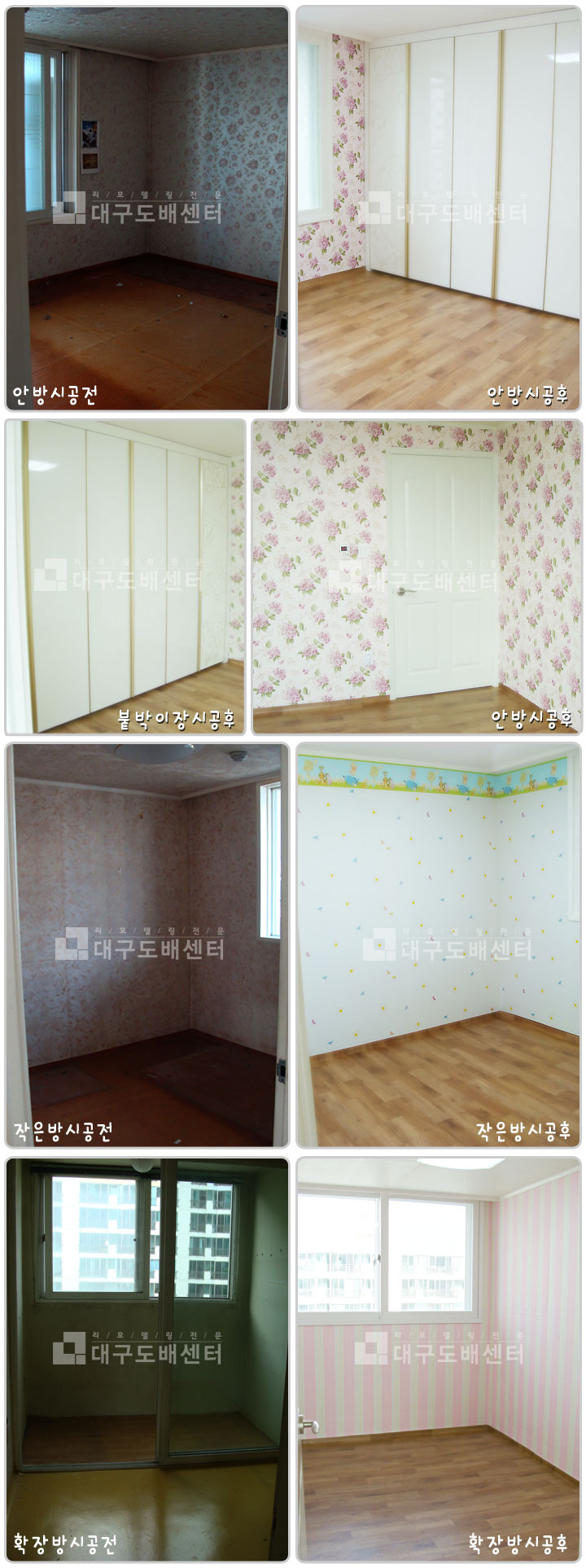 경산시 옥산동 평광신화아파트 24평 리모델링(안방, 작은방, 확장방공사) 운영자 (118.♡.244.199) 20평형대 0 4609 2010.01.03 23:03 안방, 작은방, 확장방 공사 스케치입니다. ------------------------------------ 안방엔 꽃무늬 벽지를 시공하였고. 붙박이장 시공하였습니다. 실크도배 및 장판 시공하였습니다.