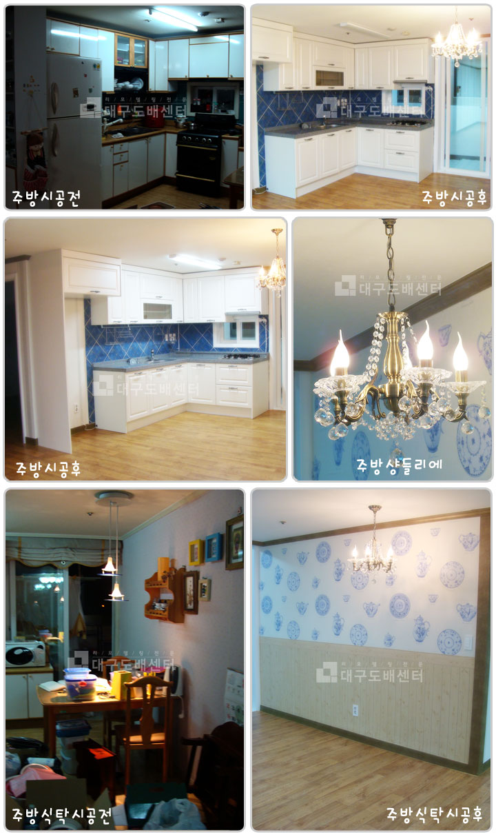 경산시 정평동 한솔2차아파트 32평 리모델링 (주방공사) 운영자 (119.♡.42.193) 30평형대 0 4970 2009.10.29 15:26 <주방, 싱크대 공사스케치입니다.> 싱크대, 식탁쪽에 상하부 나누어서 벽지 시공하고 샹들리에 등을 달았습니다