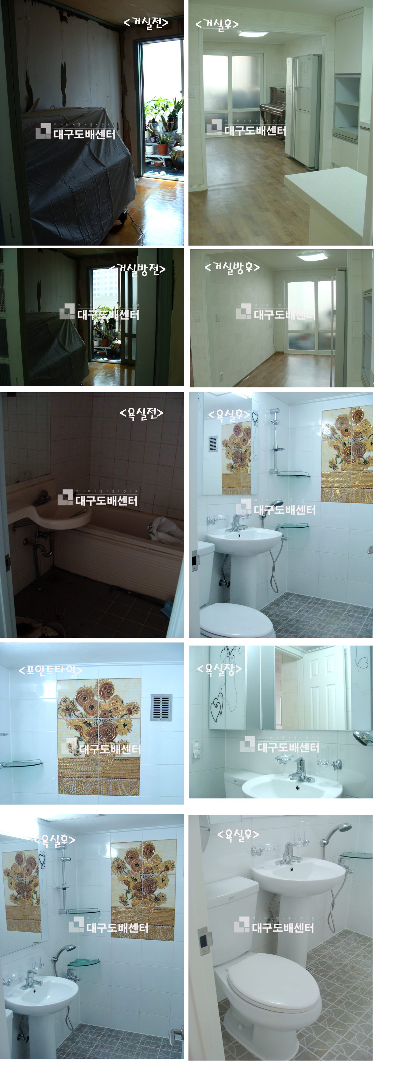 경산시 옥산동 개나리아파트 22평 리모델링 운영자 (121.♡.95.124) 20평형대 0 6256 2009.05.30 15:03 거실주방 문턱제거, 도색, 실크도배, 장판, 조명,싱크, 욕실, 신발장, 아일랜드식탁 세탁기장, 손잡이교체, 스위치콘센트 교체등을 공사했습니다.