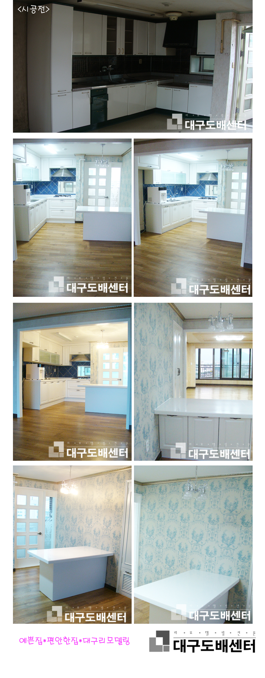 경산시 옥산동 평광신화 아파트 32평형 싱크대 리모델링 운영자 (121.♡.95.124) 30평형대 0 4948 2008.10.09 20:32 평광신화 아파트 32평 싱크대입니다. 최대한 수납을 늘리려고 했지만 한계가 있는지라 식탁 자리에 아일랜드식탁을 짜 넣었습니다. 소비자분이 파란색을 좋아하셔서 파란타일과 흰싱크대가 무척 어울립니다. 이국풍의 파란벽지가 식탁등과 어울려 빛이 나네요^^