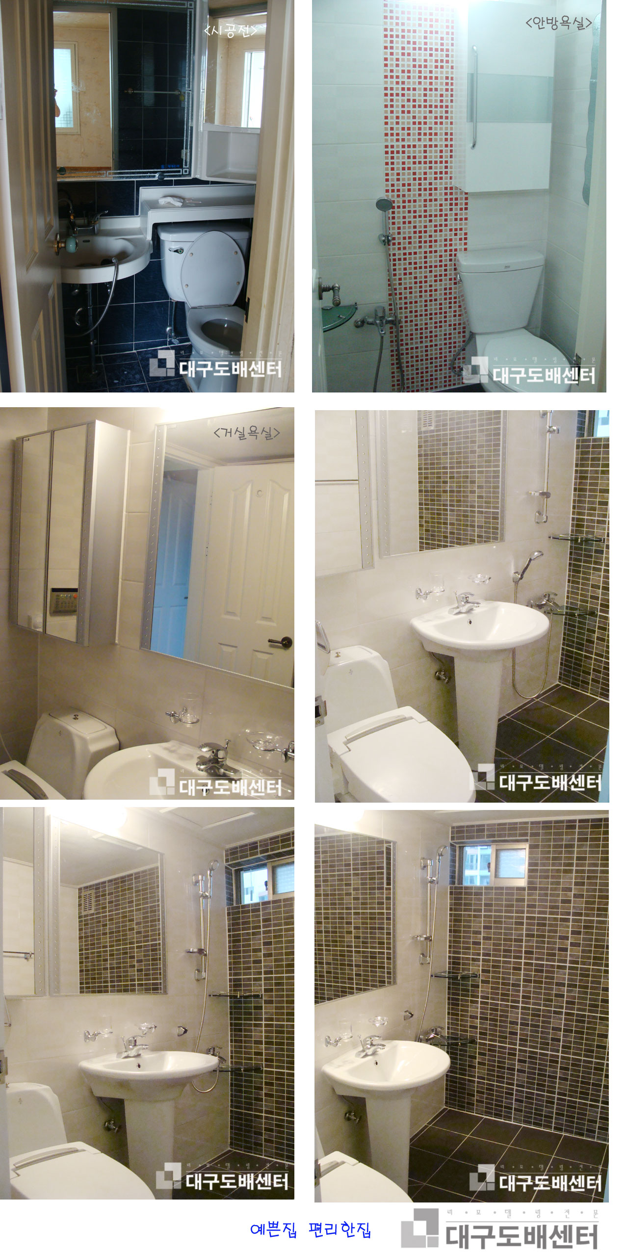 경산시 옥산동 평광신화 아파트 32평형 거실 욕실과 안방욕실 운영자 (121.♡.95.124) 30평형대 0 4689 2008.10.11 10:57 거실욕실은 욕조를 제거하고 정면에 포인트 타일을 전면 시공하고 바닥도 포인트 타일에 맞추어 어두운 색깔을 선택했더니 고급스러운 욕실이 되었습니다. 안방욕실은 옆에 붙박이장 때문에 공간이 좁은 관계로 과감히 세면대를 없애고 샤워시설을 설치 했습니다. 바깥분이 빨간색을 좋아하셔서 빨강체크 포인트를 시공 했습니다.