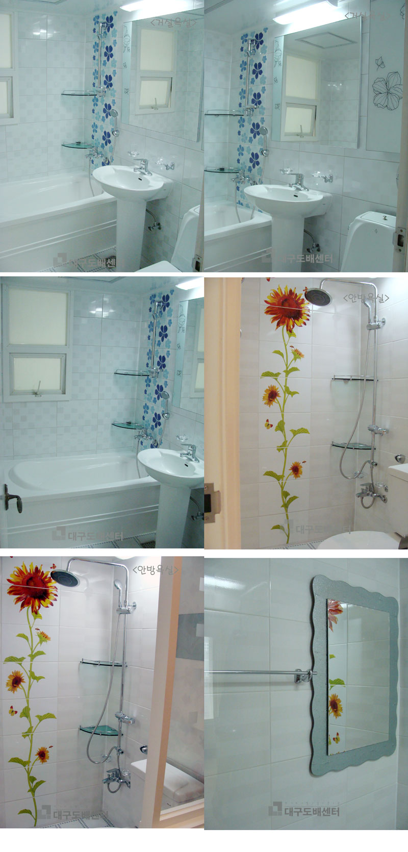 대구시 북구 침산동 침산동서아파트 32평 거실욕실과 안방욕실 운영자 (121.♡.95.124) 30평형대 0 4843 2008.10.18 16:48 침산동서 아파트는 거실욕실이 일반욕실과 달리 UBR(unit bath room)욕실입니다. 플라스틱 일체형이라서 전체를 철거하고 방수공사, 배관공사등 욕실을 완전히 새로 만들었습니다. 안방욕실은 해바라기 수전과 해바라기 포인트타일로 꾸몄습니다. 부부만 쓰는 안방욕실은 예쁘면서도 꼭 필요한 것들로 꾸며 보았습니다.