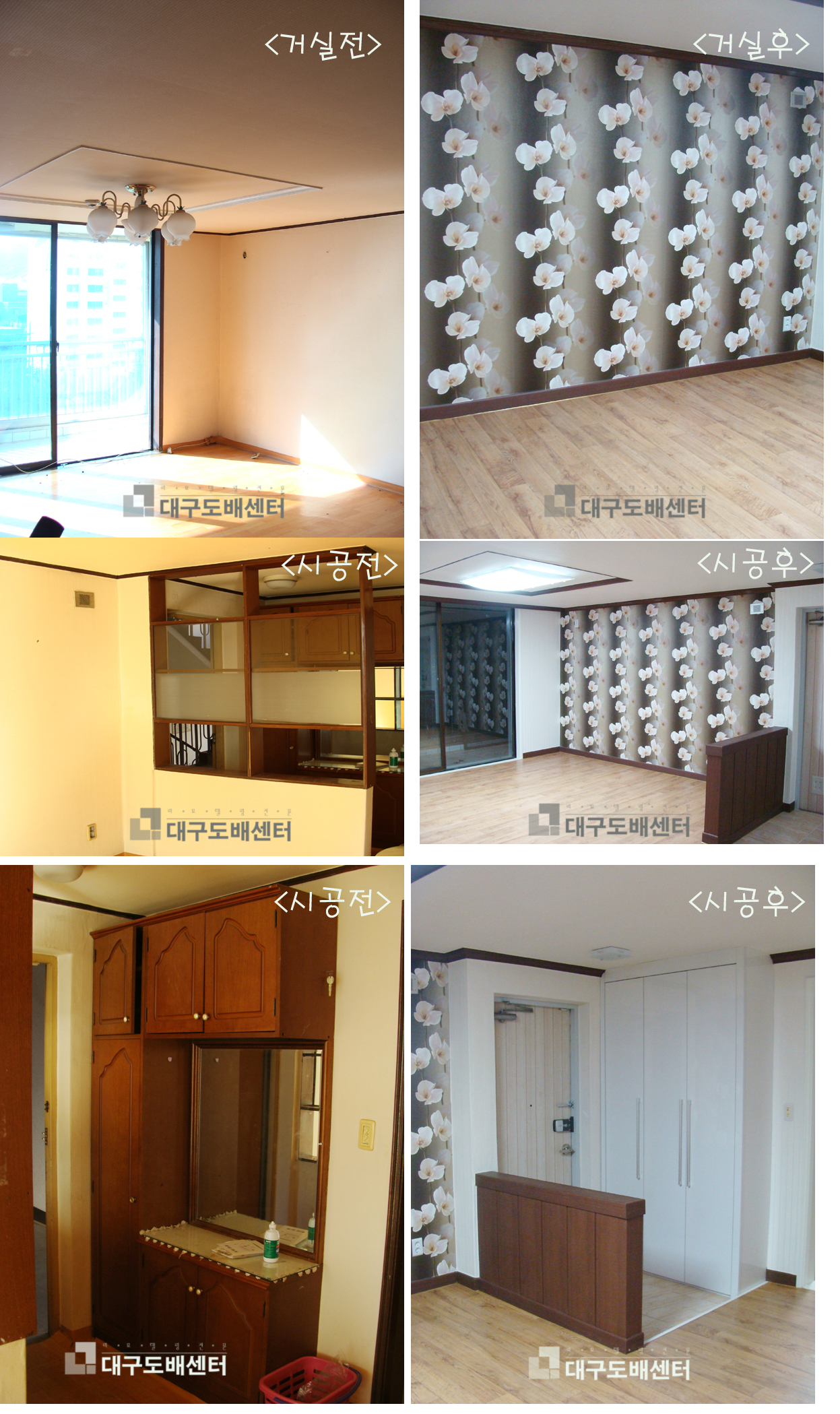 경산시 정평동 현대아파트 32평아파트 거실, 몰딩, 신발장(102제곱미터) 운영자 (121.♡.95.124) 30평형대 0 5074 2008.11.21 19:46 현대아파트는 거실,방 모두 몰딩을 새로 시공하고 걸레받이, 코너기둥, 등박스를 새로 설치했습니다. 현관 입구에 있는 오래된 선반을 철거하고 낮은 분리대만 설치해서 현관을 시원하게 오픈 했습니다. 흰색 신발장을 설치해 현관이 한층 환해 졌습니다.
