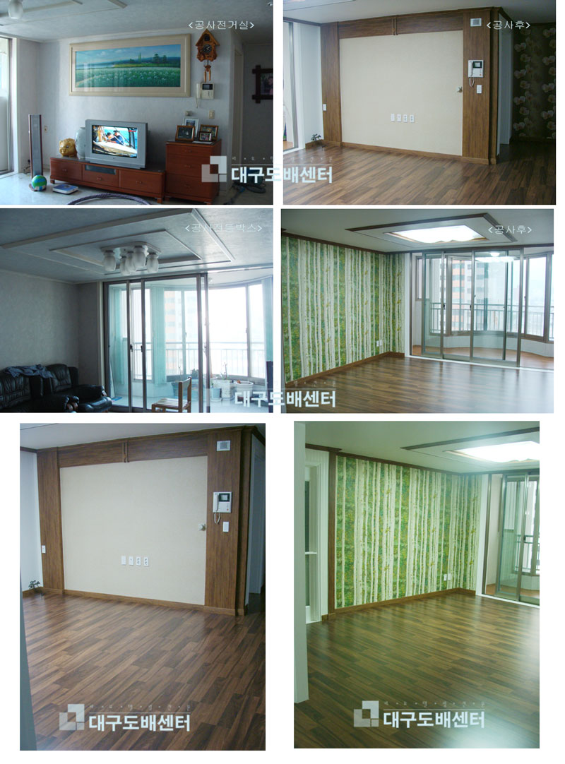 대구시 북구 칠성동 성광우방타운 32평(109.09제곱미터)아파트 리모델링 운영자 (121.♡.95.124) 30평형대 0 5068 2008.06.11 19:21 기존 살고 계시는 집에 이삿짐센타에 짐을 맡기시고 전체 수리를 했습니다. 도색, 몰딩, 아트월, 도배,마루, 욕실, 싱크, 수납장, 조명등까지 전체적인 리모델링 공사를 하였습니다.