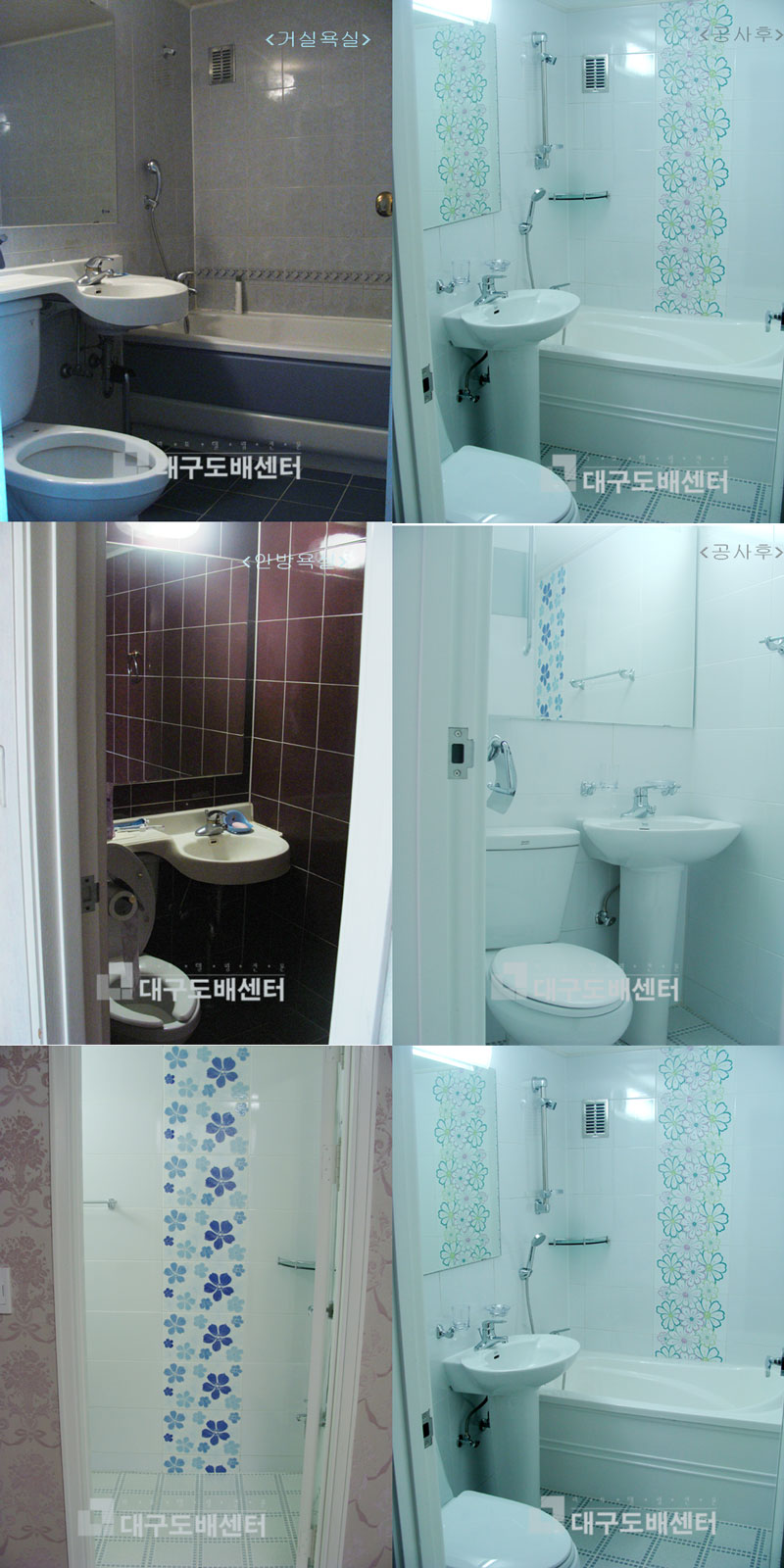 대구시 북구 칠성동 성광우방타운 32평 거실욕실과 안방욕실 운영자 (121.♡.95.124) 30평형대 0 4864 2008.06.12 15:27 거실욕실은 욕조를 넣고 포인트타일을 넣었습니다. 안방욕실은 진한색 붉은 타일에서 흰색 밝은 타일로 바꾸었더니 훨씬 넓어졌습니다. 파란색 포인트타일이 아주 산뜻합니다.