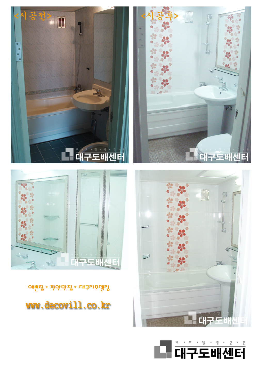 대구 수성구사월보성아파트 32평 욕실 리모델링 운영자 (121.♡.95.88) 30평형대 0 4751 2008.03.26 19:08 대구 시지에 있는 사월보성아파트 거실욕실 리모델링을 하였습니다. 미끄럼방지 타일과 꽃무늬 포인트 타일로 포인트를 주었습니다.