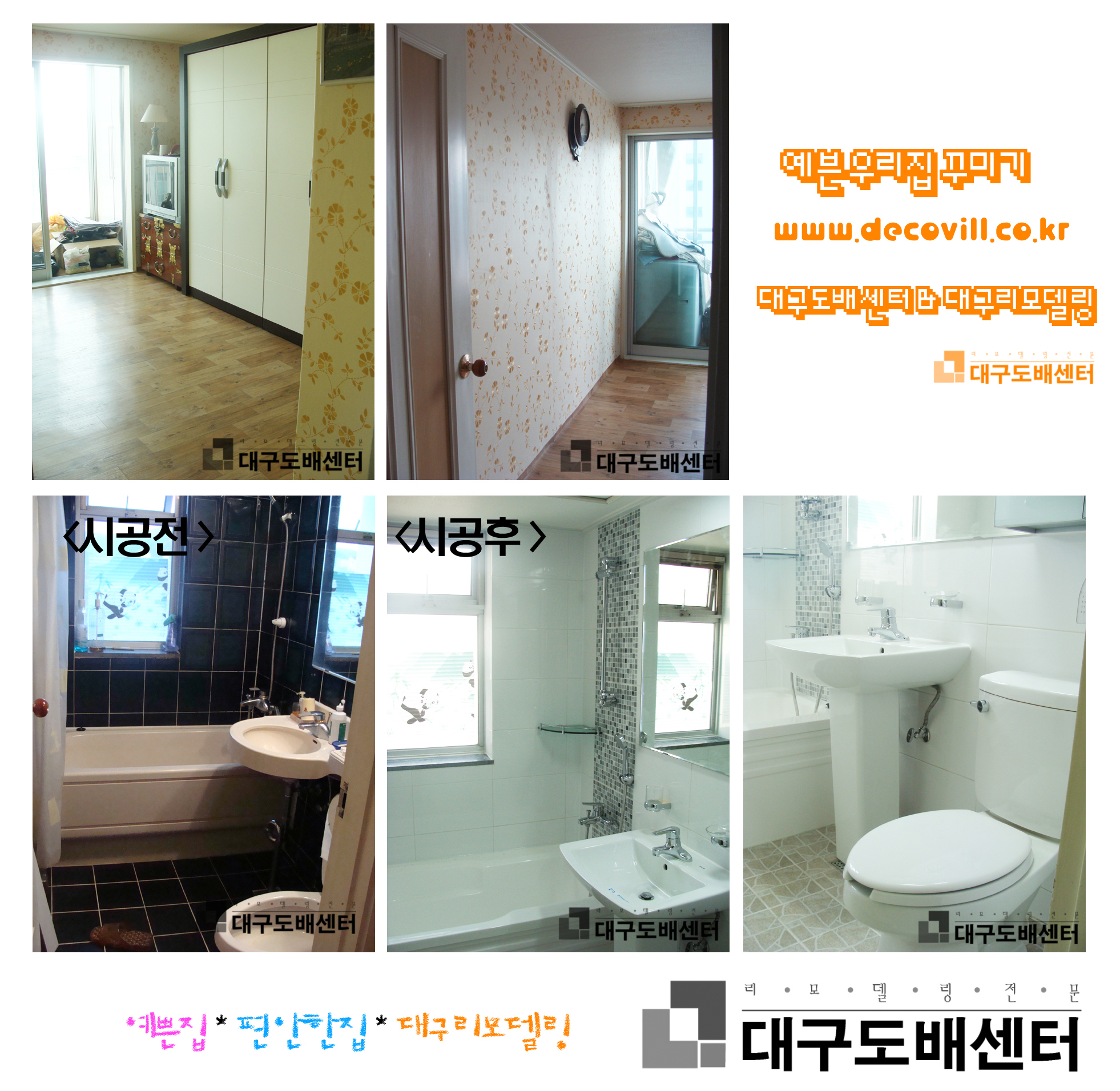 대구시 동구 지묘동 태왕그린힐즈49평 어머님방리모델링(161제곱m) 운영자 (121.♡.95.24) 40-50평형대 0 4158 2008.03.06 15:52 대구 지묘동 태왕그린힐즈 아파트 리모델링 공사를 하였다. 거실욕실은 욕조를 없애고 파티션을 설치하였고 안방욕실은 욕조를 넣고 포인트타일을 하였습니다. 어머님방은 금색벽지를 선택하셨는데 실제로 시공하니 훨씬 예뻤습니다.