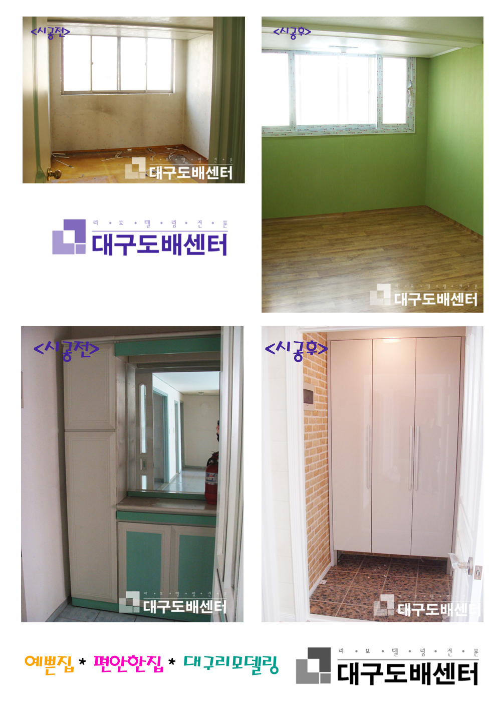 대구 수성구 사월 보성 아파트 안방 & 작은방& 신발장 리모델링 운영자 (121.♡.95.88) 일반 0 3858 2008.03.26 18:34 대구 시지 사월 보성 아파트를 도색, 욕실, 도배, 장판, 싱크, 신발장, 조명, 콘센트, 샷시 교체 등 리모델링 공사를 하였다. 벽지 색깔이 시공하니 더 예쁘다고 아주 만족스러워 하셔서 저희도 기뻤습니다. 전체적으로 깔끔한 컵셉으로 진행 되었는데 소비자분도 만족하셔서 저희도 고생한 보람이 있었습니다.
