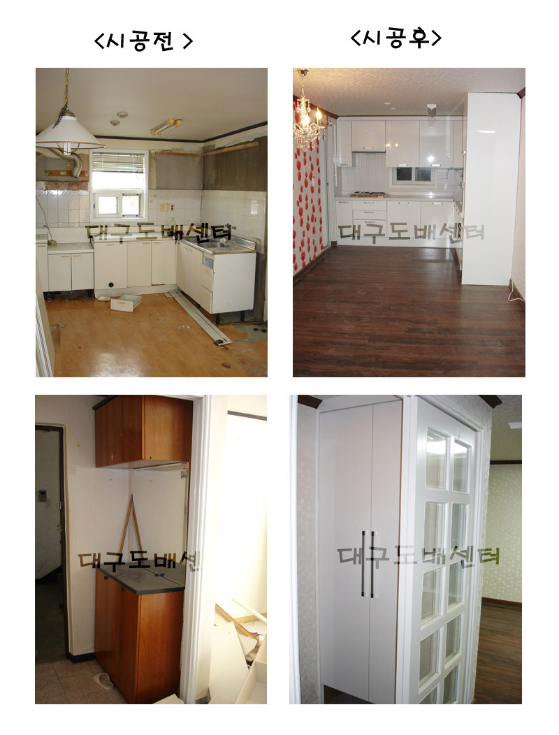 지산 협화32평 시공전후사진3) 운영자 (121.♡.95.210) 30평형대 0 4934 2007.01.14 18:26 씽크대는 창문 윗부분을 막아 수납공간을 넓히고 기존장에 키큰장을 추가했습니다. 식탁쪽은 포인트 벽지를 붙이고 샹들리에등을 달았습니다.
