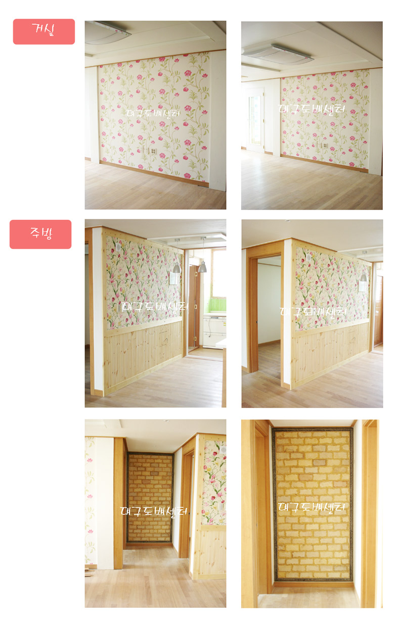 황금동 롯데 캐슬 확장공사(2) 운영자 (210.♡.195.215) 일반 0 3319 2006.09.22 17:35 거실에 원목으로 테두리를 하고 포인트벽지 시공, 주방한벽에 원목패널을 짜넣고 천벽지로 화사한 분위기를 냈습니다. 안방과 작은방 사이는 황토타일을 시공해서 건강까지 생각했습니다.