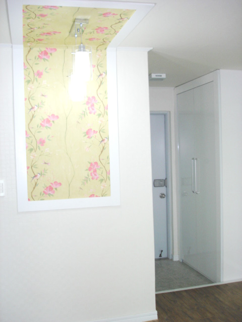 식탁 자리에 포인트 벽지를 바르고 현관 입구에 화이트 신발장을 천정까지 짰습니다.