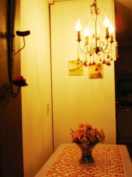 식탁등을 샹들리에로 바꾸고 식탁위에 타일을 붙였어요. ^-^