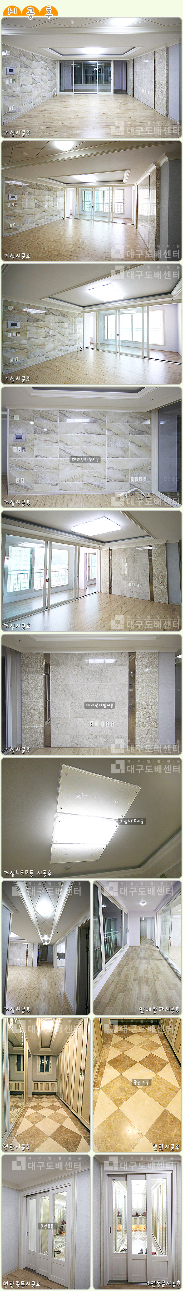 경산시 옥곡동 우방유셀아파트 102동 152㎡(46평) 리모델링① - 거실,베란다, 현관 운영자 (203.♡.213.235) 40-50평형대 0 4924 2015.10.18 21:55 거실, 베란다, 현관 리모델링 공사 후 스케치입니다.------------------------------------------------------------------------------------------ 실크도배, 강화마루시공, 거실대리석타일시공, 신발장 및 현관타일, 줄눈시공, 거실 LED조명교체, 현관 3연동 중문 , 세탁기 돋움공사등을 했습니다.