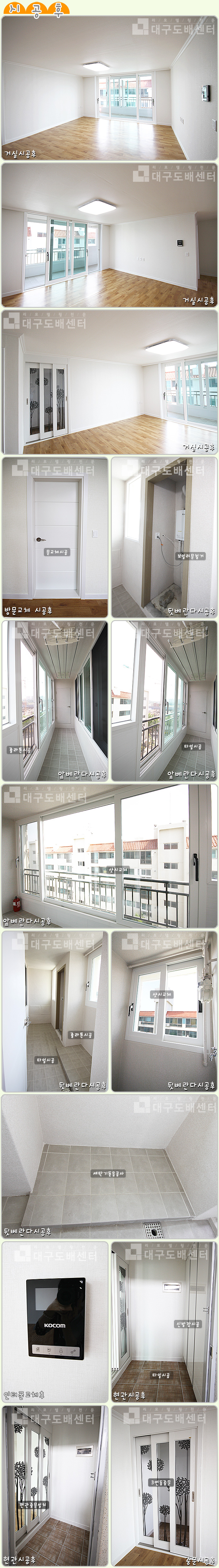 대구시 불로동 불로우방아파트 102동 32평(105㎡) 리모델링공사 운영자 (125.♡.219.135) 30평형대 0 4974 2015.10.04 19:06 리모델링 공사 후 스케치입니다.------------------------------------------------------------------------------------------1993년에 지어진 20년이 넘는 저층 아파트입니다.처음에 아파트를 보시고 주인분이 많이 실망하셨지만리모델링후 만족하시는 모습에 저희도 뿌듯했습니다^^ 공사내용은 실크도배, 장판,욕실공사, 도장싱크, 신발장, LED조명, 도색,스위치콘센트교체, 몰딩공사, 인터폰, 디지털키, 샷시공사, 베란다타일공사,세탁기돋음공사 등을 했습니다