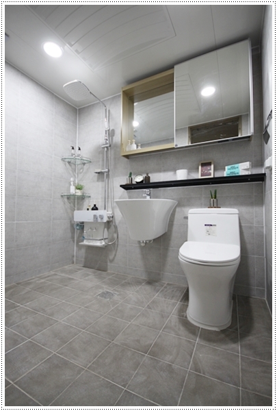공사내용은 욕조철거, 천정돔시공문과 문틀 철거 후 시공반다리일체형 세면기, 투피스치마형변기수납형레인샤워수전(언더커버,비누대)대리석선반, 1도어슬라이드장, 코너선반악세사리, LED조명을 시공하였습니다.대림바스플랜 원피스 양변기 PC-9023